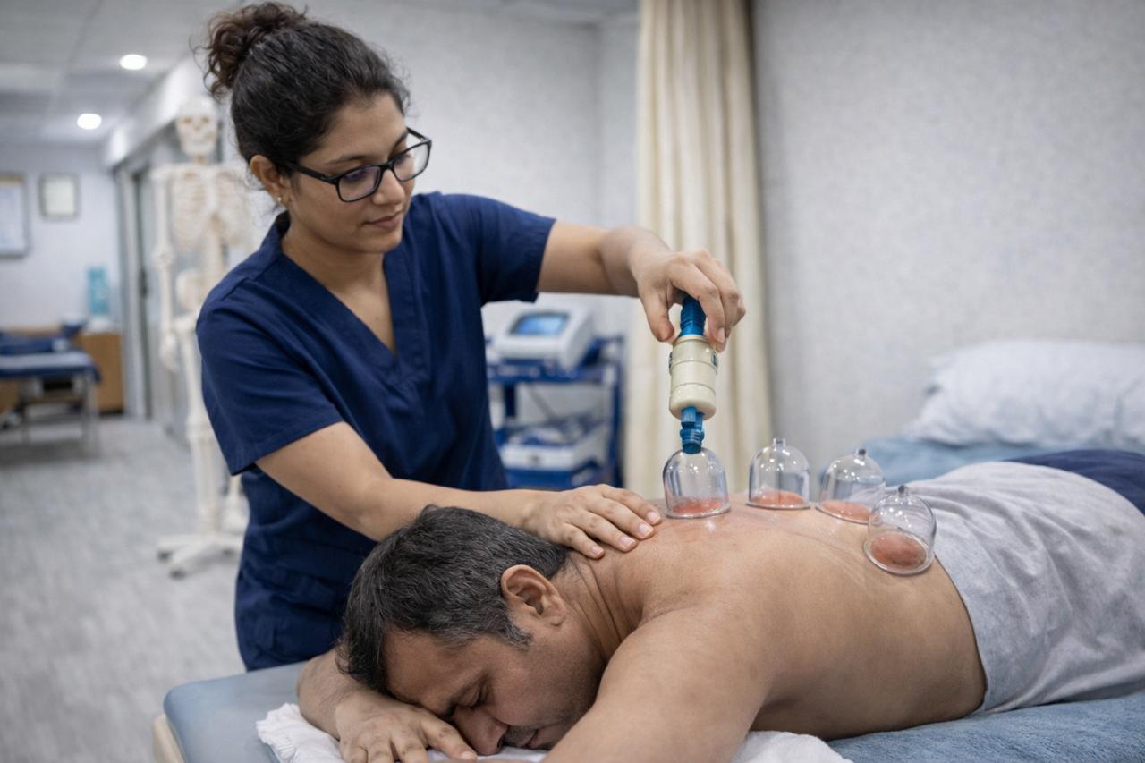Cupping therapy is a traditional therapeutic technique used to improve blood circulation, reduce muscle tension, and promote healing. By creating suction on the skin, it helps reduce pain and enhance recovery in affected areas.