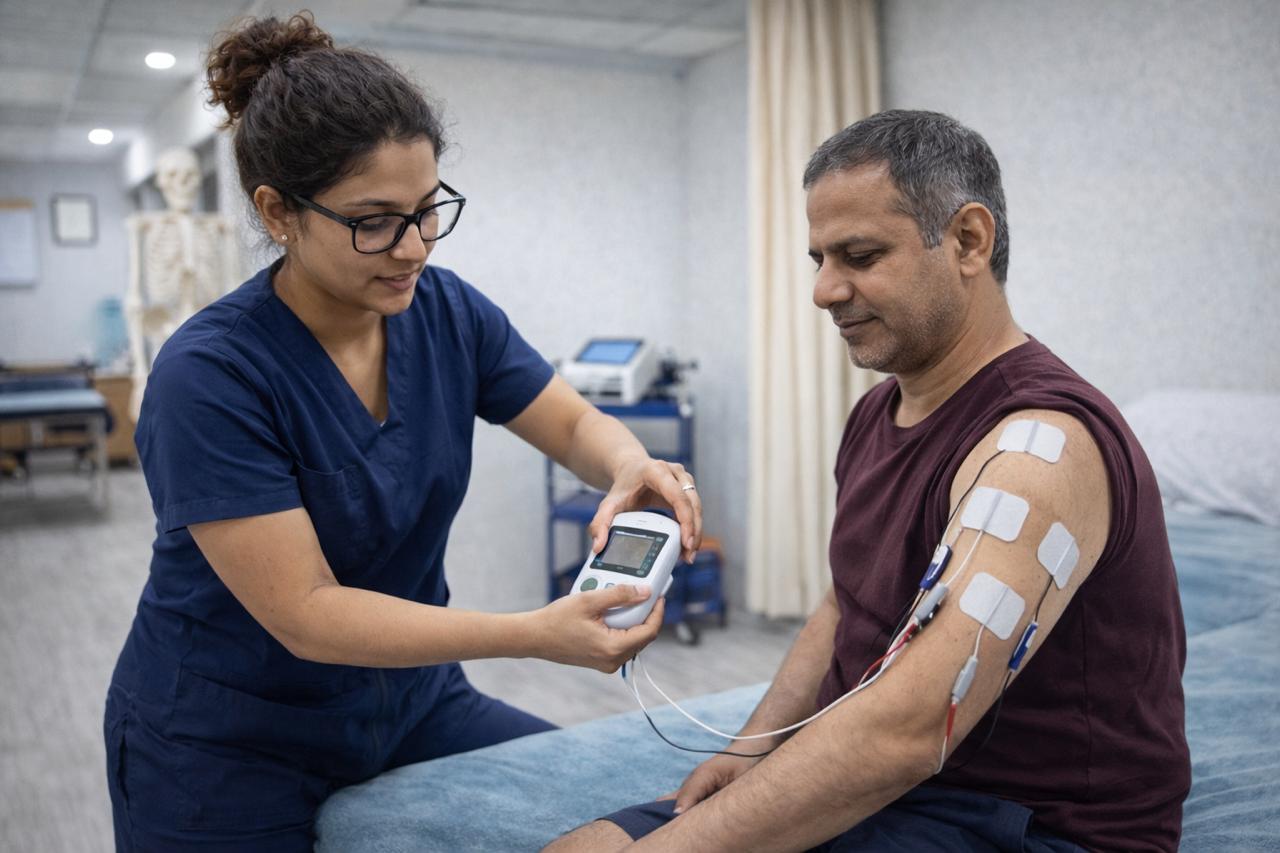 Electrotherapy uses controlled electrical stimulation to manage pain, reduce inflammation, and improve muscle function. It is commonly used for chronic pain, arthritis, muscle weakness, nerve pain, and musculoskeletal injuries as part of a comprehensive rehabilitation plan.